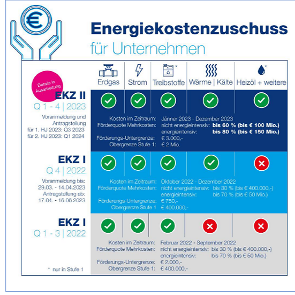 Der Energiekostenzuschuss I („EKZ I“) wurde offiziell bis Ende Dezember 2022 verlängert. Der förderfähige Zeitraum beläuft sich auf 1. Oktober 2022 bis 31. Dezember 2022.